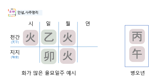 을묘일주의 일간은 을목이기 때문에, 을목을 기준으로 병오의 병화, 오화와의 관계를 따집니다.
