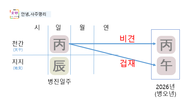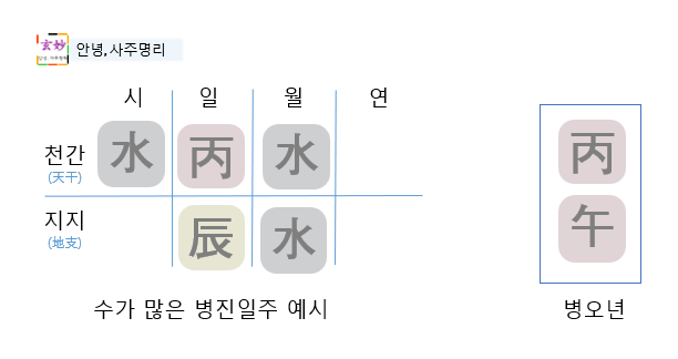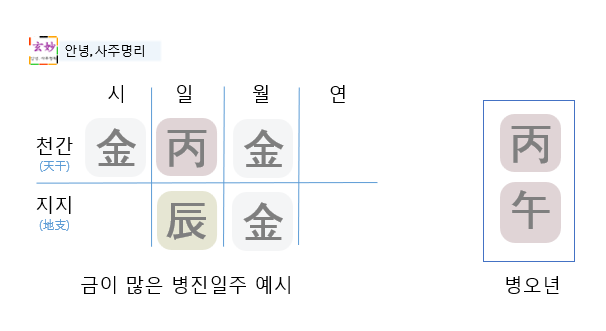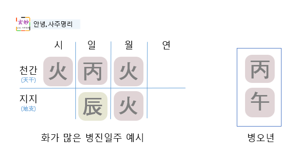 병진일주의 일간은 병화이기 때문에, 병화를 기준으로 병오의 병화, 오화와의 관계를 따집니다.