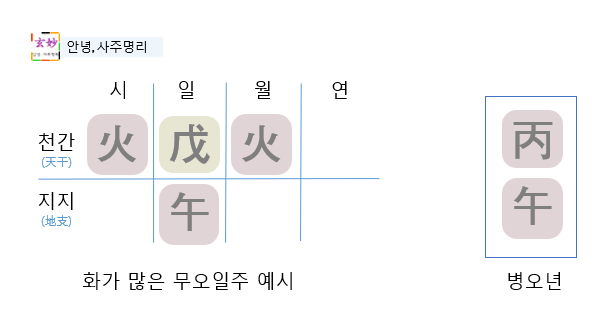 무오일주의 일간은 무토이기 때문에, 무토를 기준으로 병오의 병화, 오화와의 관계를 따집니다.