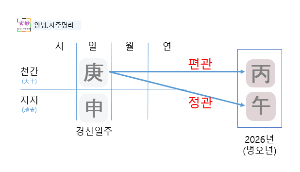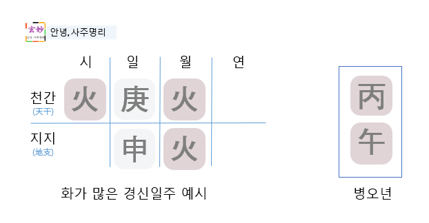 경신일주의 일간은 경금이기 때문에, 경금을 기준으로 병오의 병화, 오화와의 관계를 따집니다.