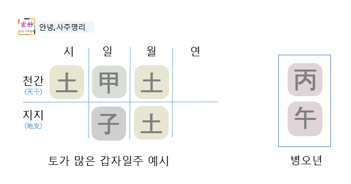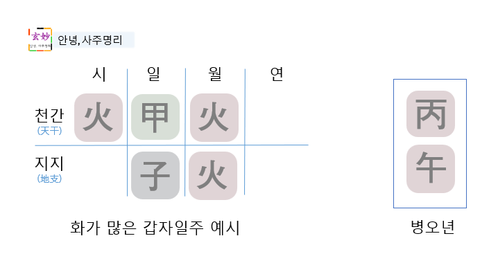 갑자일주의 일간은 갑목이기 때문에, 갑목을 기준으로 병오의 병화, 오화와의 관계를 따집니다.