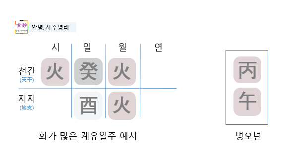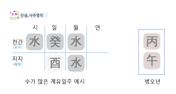 계유일주의 일간은 계수이기 때문에, 계수를 기준으로 병오의 병화, 오화와의 관계를 따집니다.