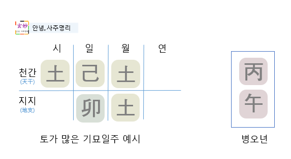 토가 많은 기묘일주는 병오년에 화생토의 작용으로 토의 기운이 더욱 강화되어 더욱 불리해질 수 있습니다.