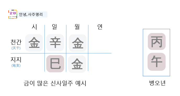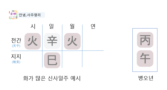 신사일주의 일간은 신금이기 때문에, 신금을 기준으로 병오의 병화, 오화와의 관계를 따집니다.