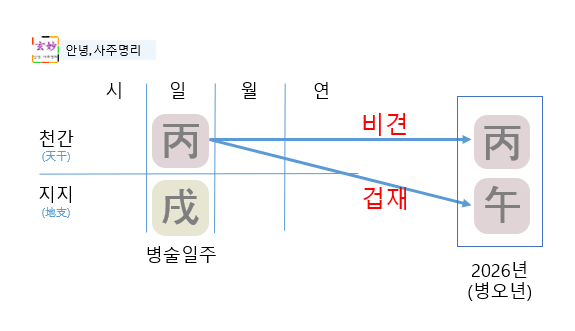 병술일주의 일간은 병화이기 때문에, 병화를 기준으로 병오의 병화, 오화와의 관계를 따집니다.