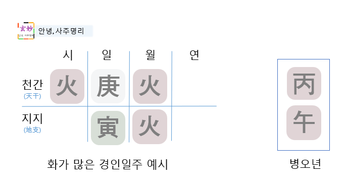 경인일주의 일간은 경금이기 때문에, 경금을 기준으로 병오의 병화, 오화와의 관계를 따집니다.