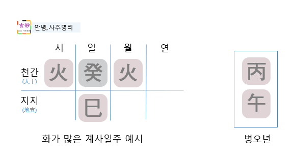 계사일주의 일간은 계수이기 때문에, 계수를 기준으로 병오의 병화, 오화와의 관계를 따집니다.