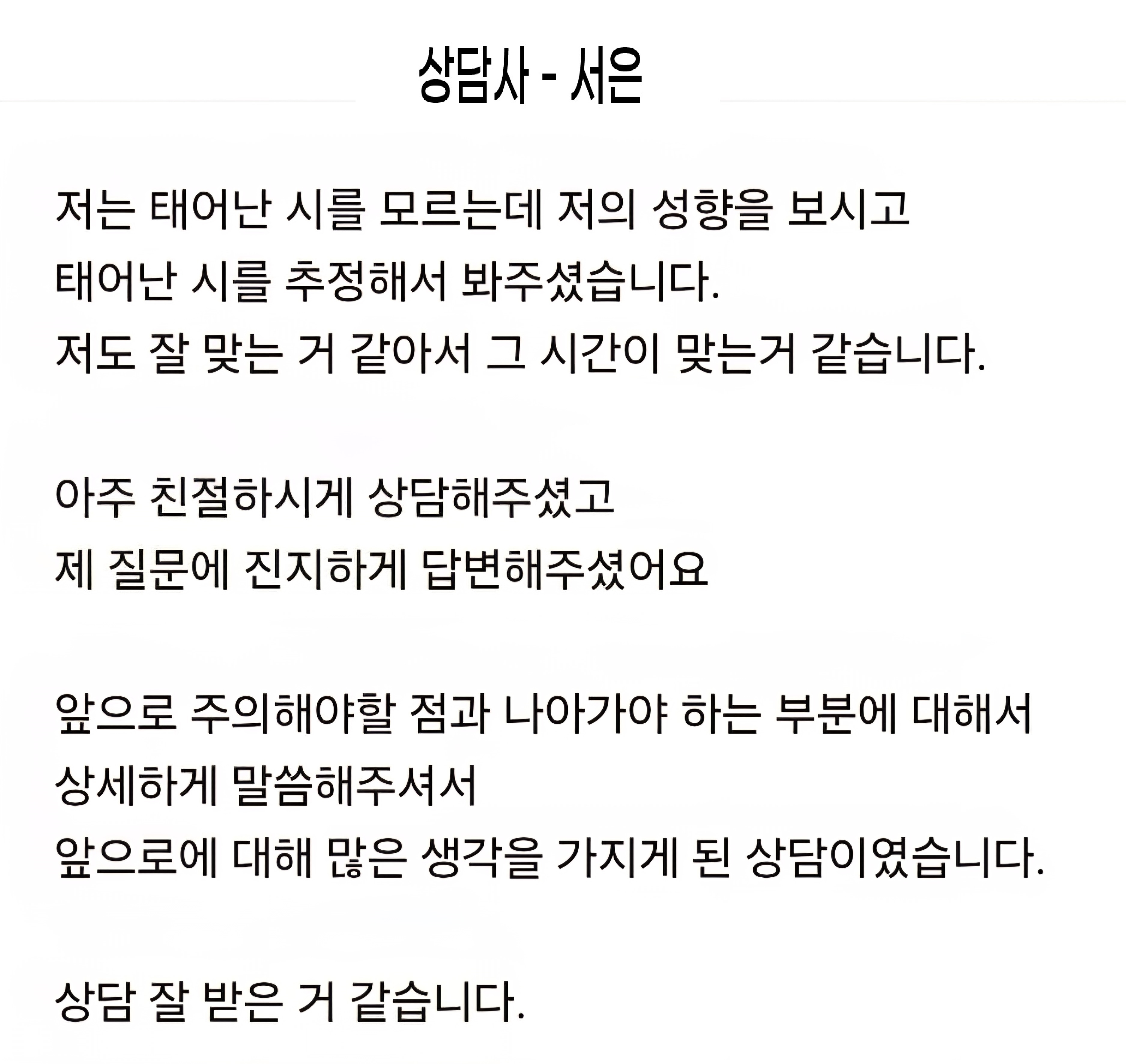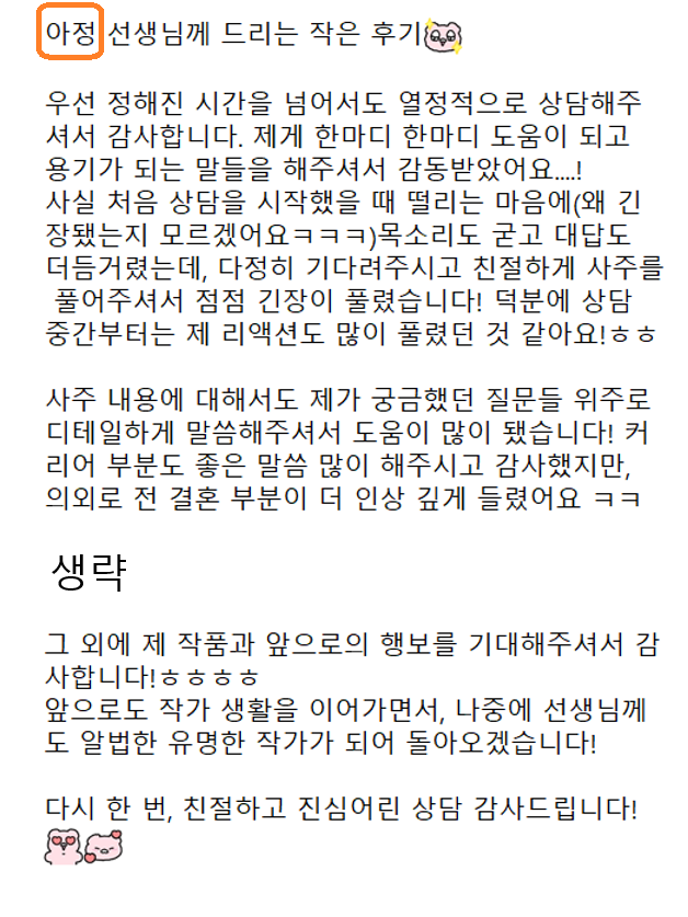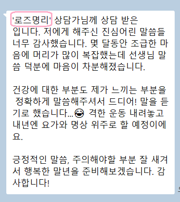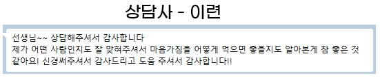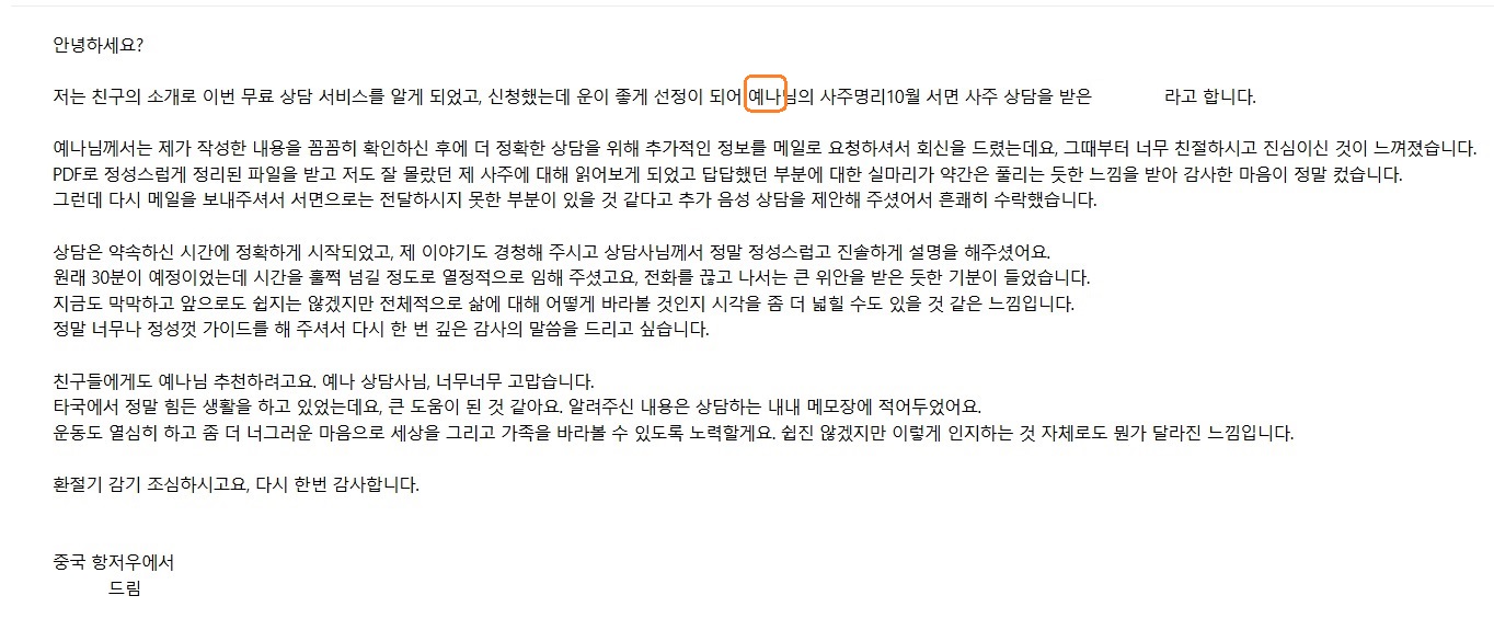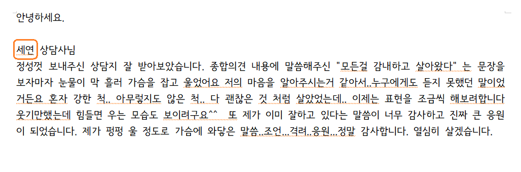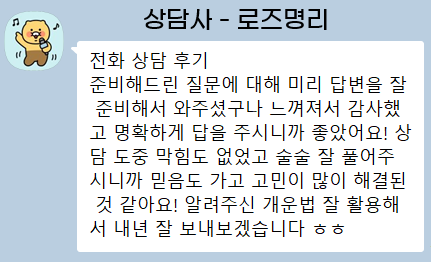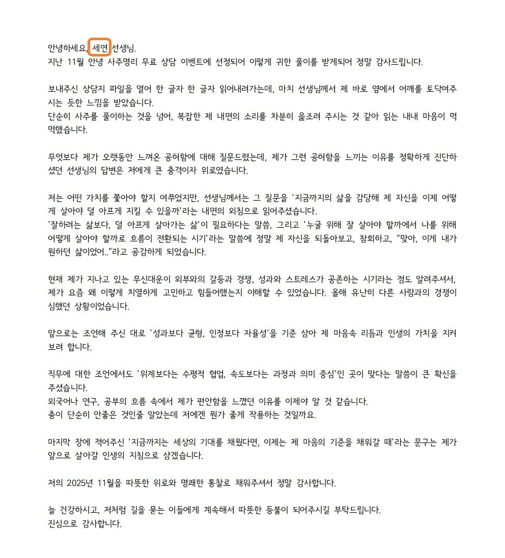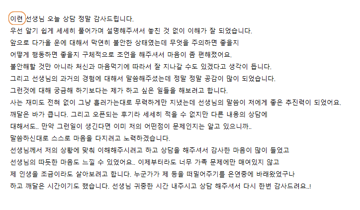 또한 온 마음을 다해 정성스럽게 상담을 임해주신 상담사 분들께도 진심으로 감사의 마음을 올립니다.