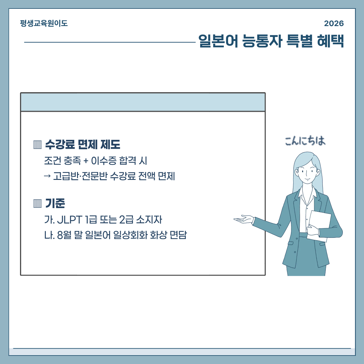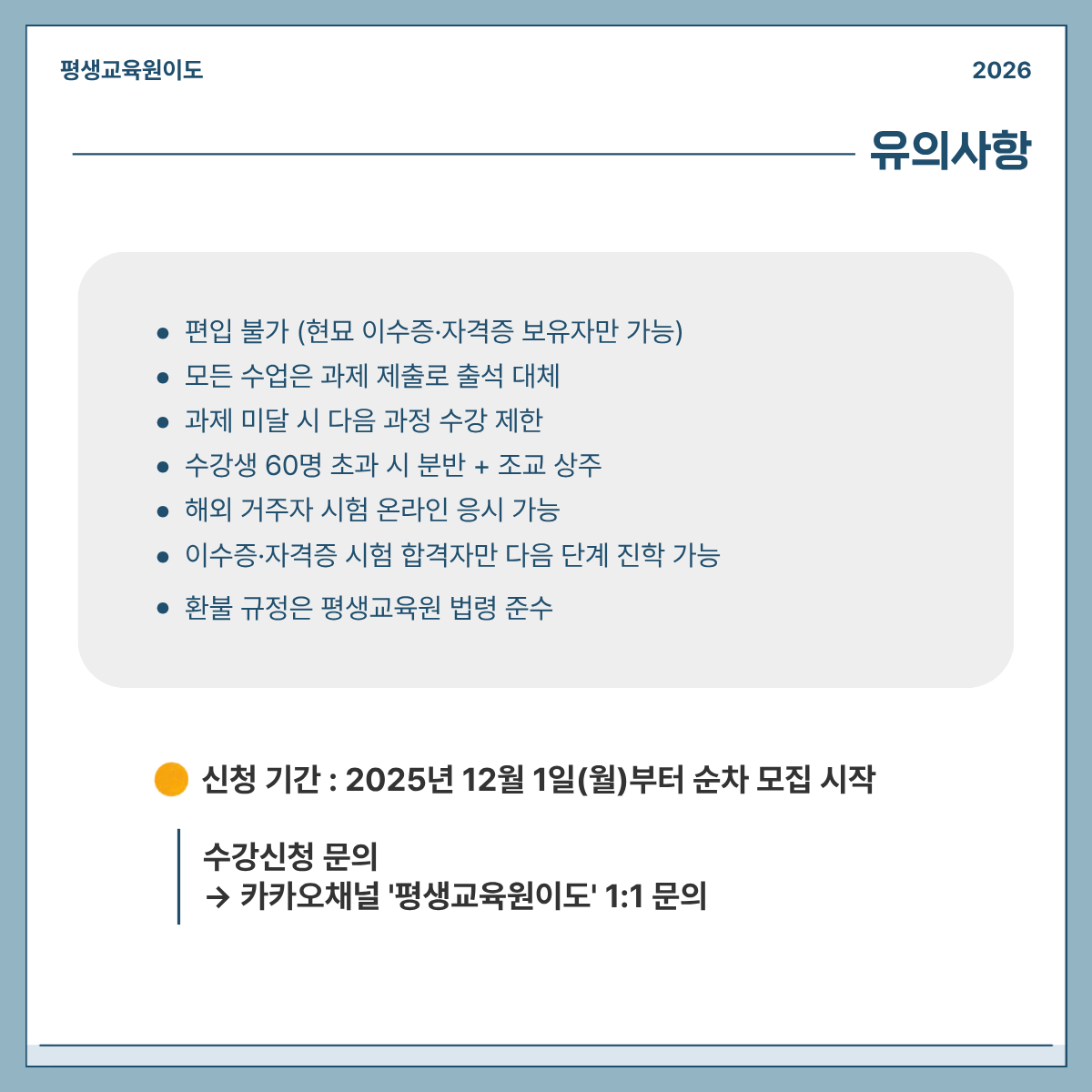 수강신청이나 수업에 대한 문의는 평생교육원 이도 카카오톡 채널을 이용해 주세요.