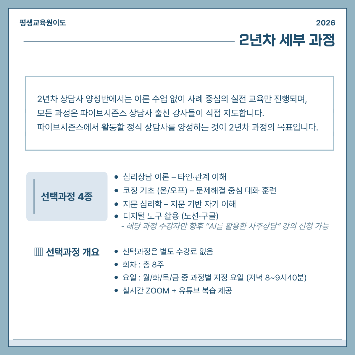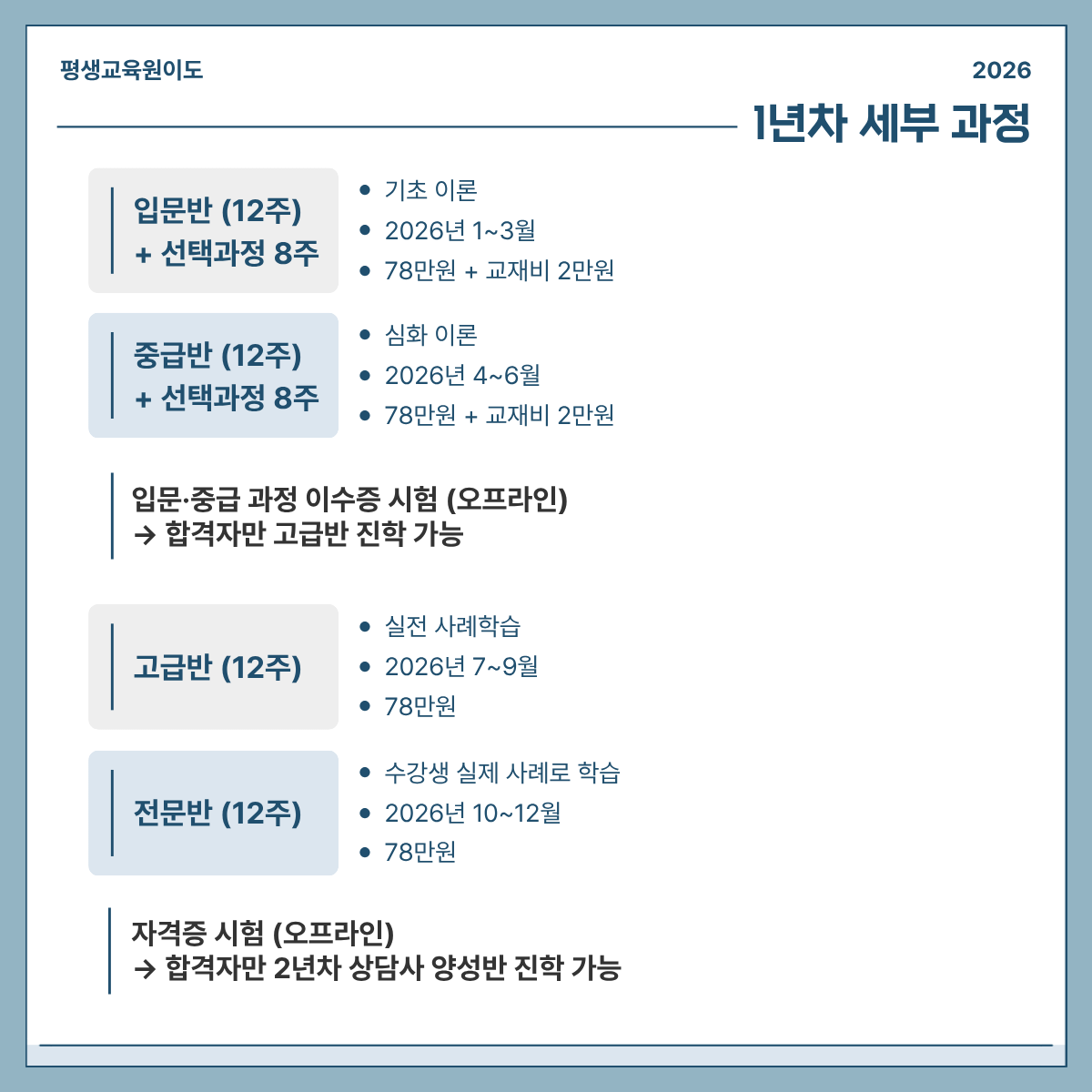 이 과정을 들으셔야 자격증, 상담사까지 연결됩니다. 타 수업 과정은 교양과정으로 콘텐츠만 제공됩니다.