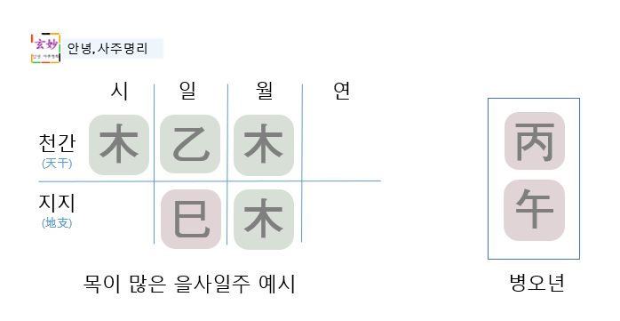 을사일주의 일간은 을목이기 때문에, 을목을 기준으로 병오의 병화, 오화와의 관계를 따집니다.