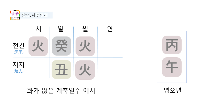 계축일주의 일간은 계수이기 때문에, 계수를 기준으로 병오의 병화, 오화와의 관계를 따집니다.