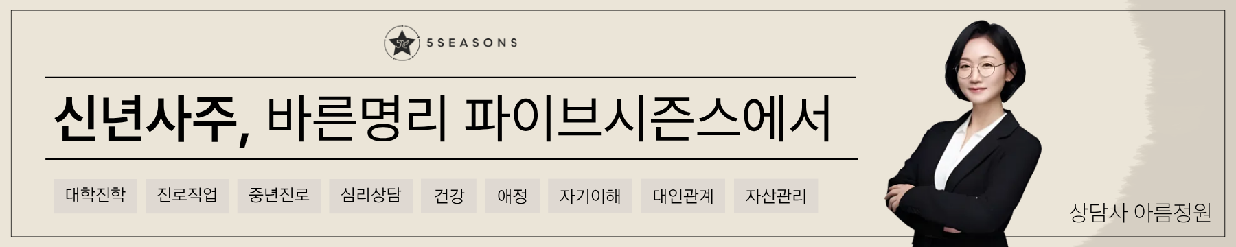 임자일주 사주 상담 및 병오년 신년 운세 상담은 파이브 시즌스 상담사 “아름정원”님과 함께하세요.