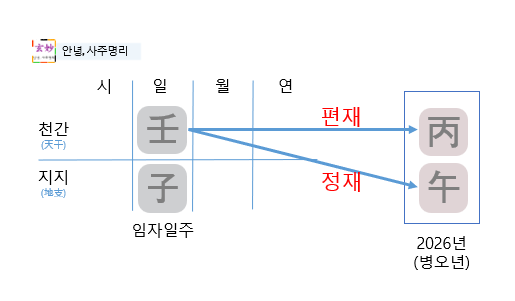2025년 을사년과 2026년 병오년은 밀접한 관계가 있습니다. 작년 임수에게는 천간으로는 상관, 지지로는 편재가 들어왔었습니다.