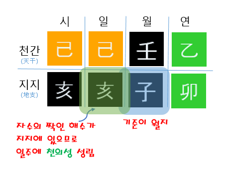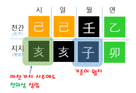 즉, 子(자수)가 월지(月支)일때, 子(자수) 이전의 단계인 亥(해수)가 지지에 있을때 성립됩니다. 마찬가지로 丑(축토)가 월지(月支)일 때, 子(자수)가 지지에 있다면 천의성이 성립됩니다.