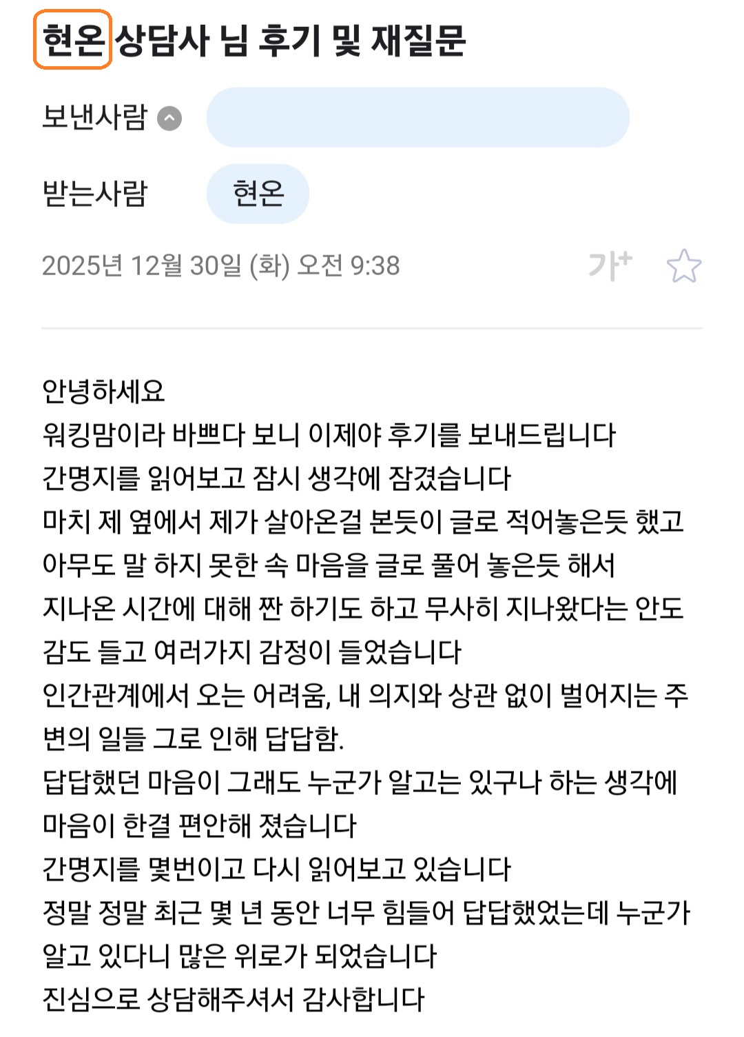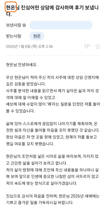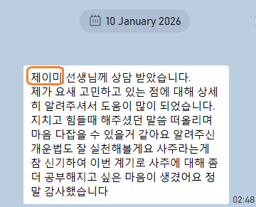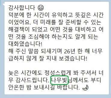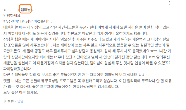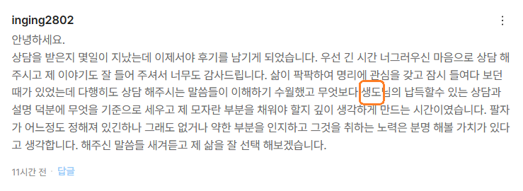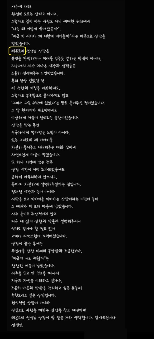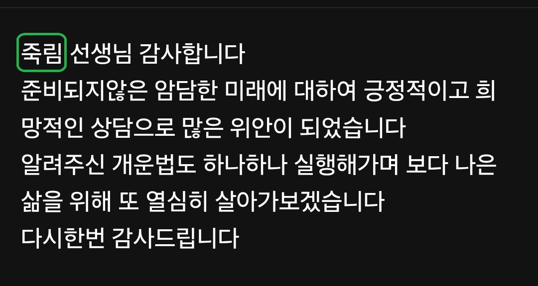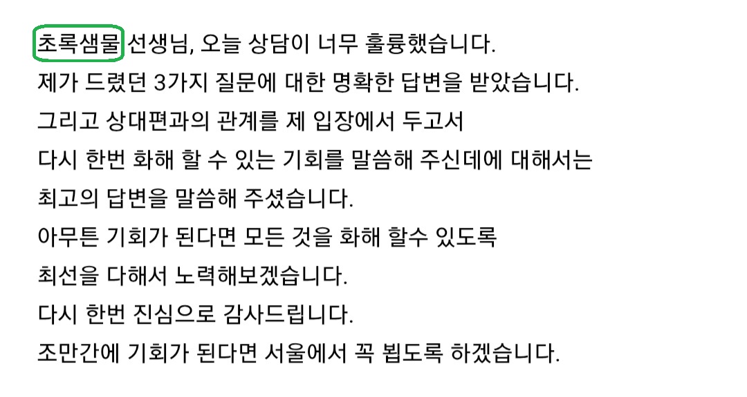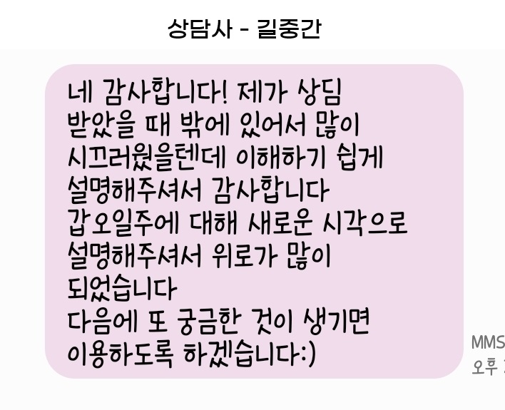 또한 온 마음을 다해 정성스럽게 상담을 임해주신 상담사 분들께도 진심으로 감사의 마음을 올립니다.