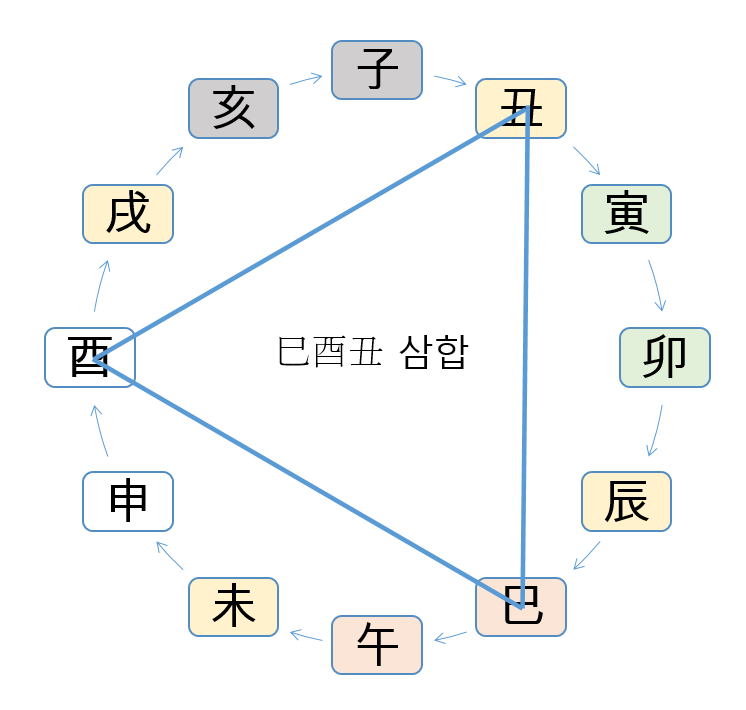사유축(巳酉丑) 삼합을 예로 들어 설명해 보면,