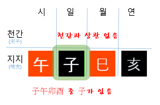 적용 : 자오묘유(子午卯酉) 중 한 글자가 지지에 있고, 그 글자의 다음 계절을 의미하는 지지(삼합)가 추가로 있을 경우 도화살에 해당