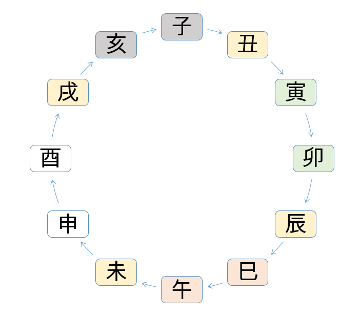 계절의 변화를 기호화 한 12지지도 마찬가지 입니다. 그래서 12지지의 배치 역시 우주의 순환성을 드러내기 위해 직선으로 하는 것이 아니라, 순환하는 궤도 위에 올려놓습니다. 아래의 그림과 같습니다. 子에서 丑의 방향으로 흘러가며 순환합니다.