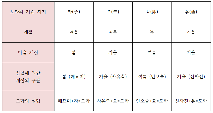 도화살은 일단 자오묘유(子午卯酉) 중 한 글자가 지지에 있어야 합니다. 그 후 해당 글자의 다음 계절을 의미하는 지지(삼합)가 추가로 지지에 있을 경우 도화살이 성립합니다.