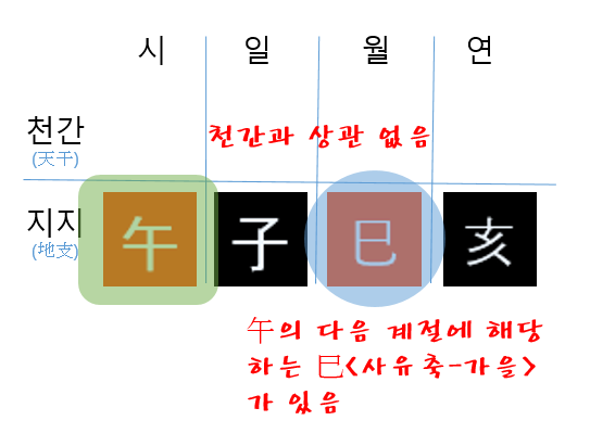 계절로 보면, 왕지는 계절의 중심에 해당합니다. 봄의 중심에 해당하는 지지 卯(묘목), 여름의 중심에 해당하는 지지 午(오화), 가을의 중심에 해당하는 지지 酉(유금), 겨울의 중심에 해당하는 지지 子(자수)가 그렇습니다. -봄 : 인묘진, 여름 : 사오미, 가을 : 신유술, 겨울 : 해자축-