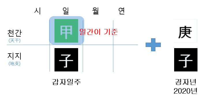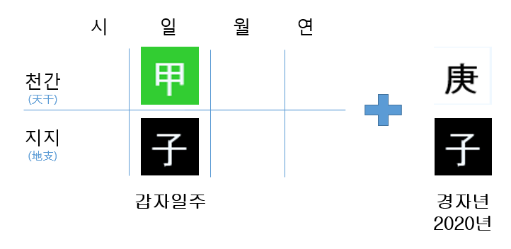 갑자일주의 일간은 甲(갑목)이기 때문에, 갑자일주의 경우 甲(갑목)을 기준으로 경자년의 庚(경금), 子(자수)와의 관계를 따집니다.