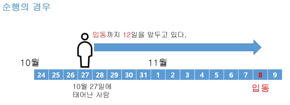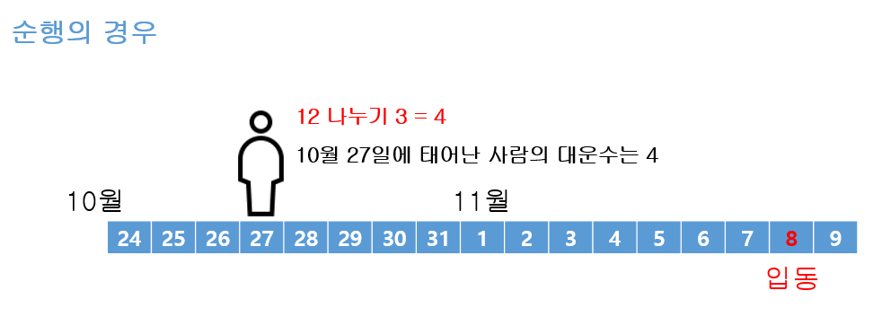 위의 그림은 2019년 10월 27일에 태어난 사람의 예로 든 것입니다. 순행의 경우 -2019년은 기해년이다, 음간에 해당하는 해이기 때문에 남자는 역행, 여자는 순행한다. 순행하는 것은 여자의 경우다- 앞으로 다가올 입동을 바라봅니다. 27에서 하나씩 날짜를 세어보면 12번만에 입동에 도착합니다. 12를 3으로 나누면 4가 됩니다. 이 여자분의 대운수는 4입니다. 즉, 4살, 14살, 24살, 34살...때 대운의 흐름이 바뀌는 것입니다.