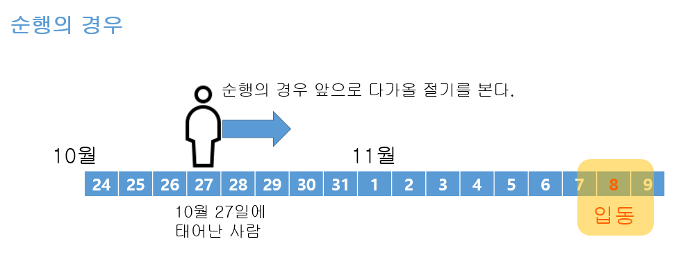 대운이 순행하는 경우에는 태어난 날짜에서 앞으로 다가올 절기를 보면 됩니다. 태어난 날짜에서 앞으로 다가올 절기가 며칠이 남았는지를 계산합니다. 그 다음음 3으로 나누면, 그 수가 대운수가 됩니다. 소수점이 생길 경우는 반올림하면 됩니다.