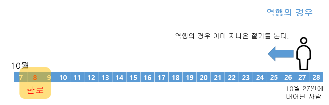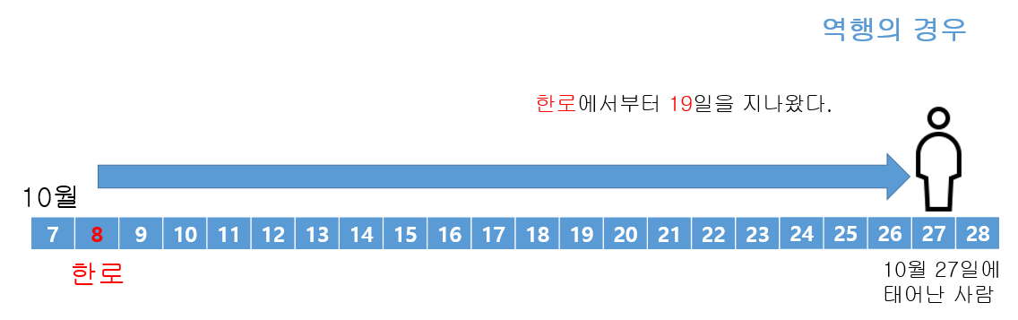 대운이 역행하는 경우에는 태어난 날짜의 이전 절기(이미 지나온 절기)를 보면 됩니다. 태어난 날짜에서 이미 지나온 절기까지가 며칠인지 계산합니다. 그 다음음 3으로 나누면, 그 수가 대운수가 됩니다. 소수점이 생길 경우는 반올림하면 됩니다.
