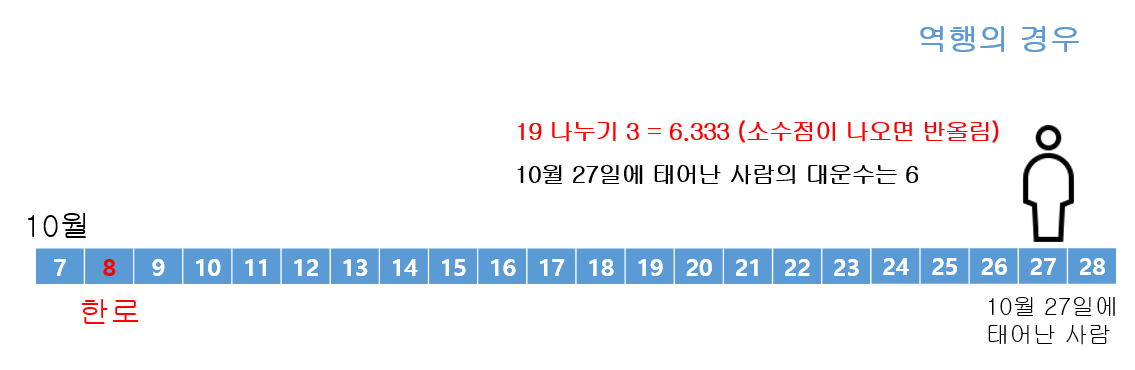 위의 그림은 2019년 10월 27일에 태어난 사람의 예로 든 것입니다. 역행의 경우 -2019년은 기해년이다, 음간에 해당하는 해이기 때문에 남자는 역행, 여자는 순행한다. 역행하는 것은 남자의 경우다- 이미 지나온 한로를 봅니다. 27에서 하나씩 날짜를 세어보면 19번만에 한로에 도착합니다. 19를 3으로 나누면 6.3333이 됩니다. 반올림하면, 이 남자분의 대운수는 6입니다. 즉, 6살, 16살, 26살, 36살...때 대운의 흐름이 바뀌는 것입니다.