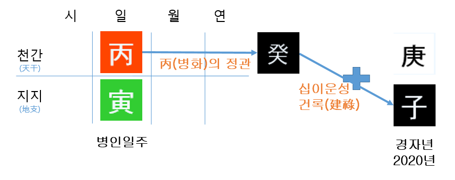 정관(正官)은 남자 기준으로는 직장, 여자 기준으로는 직장이나 배우자에 해당합니다. 丙(병화) 입장에서 정관(正官)은 천간을 기준으로 보았을 때 癸(계수)입니다. 癸(계수)의 경우 2020년, 경자년에 십이운성 "건록(建碌)"의 단계로 진입합니다.