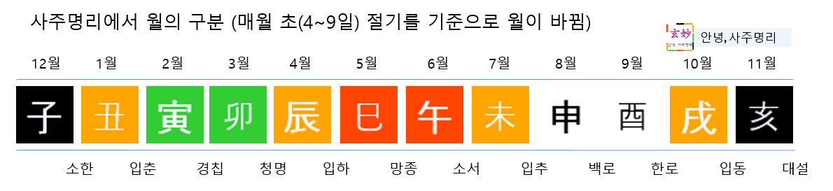 경자년(2020년)에 신살이 적용되는 것을 정리해 놓았는데, 월의 기준을 헷갈리실 수 있어 사주명리에서 월을 구분하는 방법을 간단히 짚고 넘어가겠습니다.