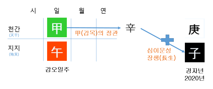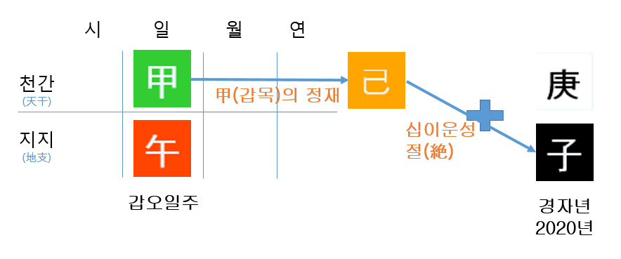 갑오일주의 일간은 甲(갑목)이기 때문에, 甲(갑목)을 기준으로 경자년의 庚(경금), 子(자수)와의 관계를 따집니다.