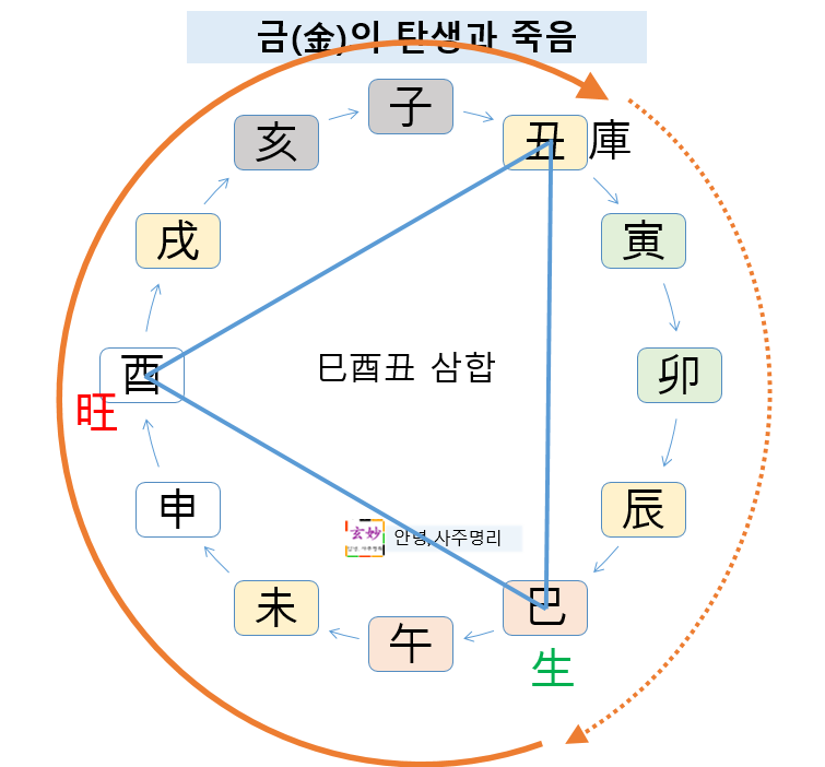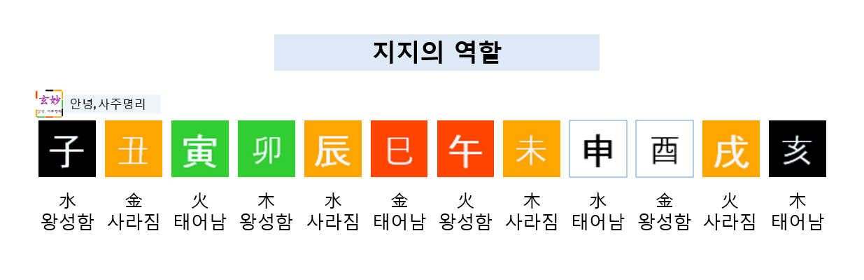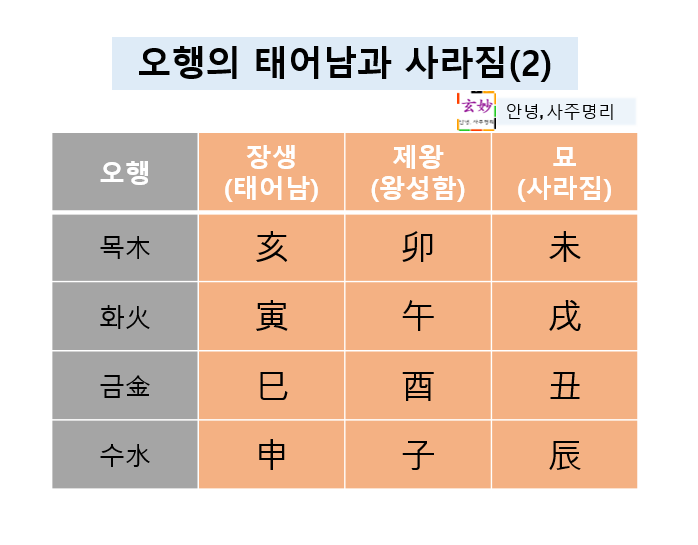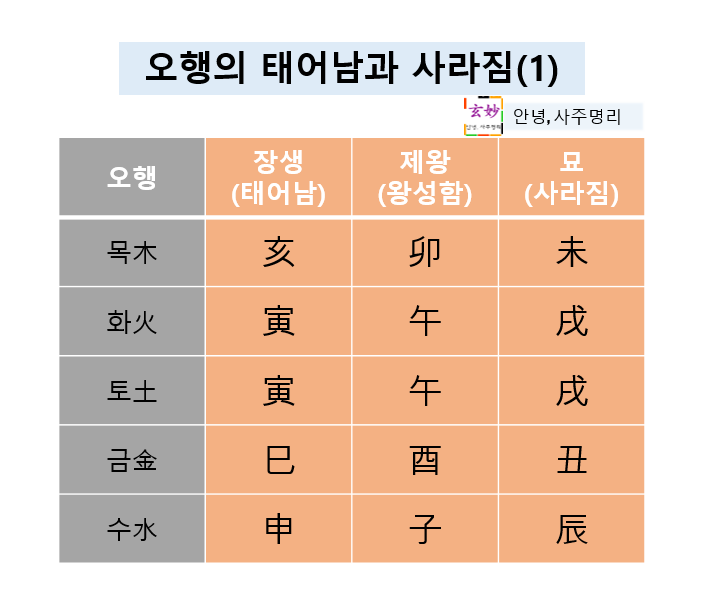 그러면 오행이 어느 지지에서 태어나고 왕성하고 사라지는지 한눈에 확인할 수 있습니다.
