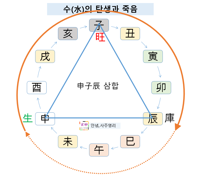 예를 들면, 오행 수水는 지상에 내려온 순간, 지지를 만나서 생명에너지를 부여받음과 동시에 생로병사의 사이클을 거치게 되는데,