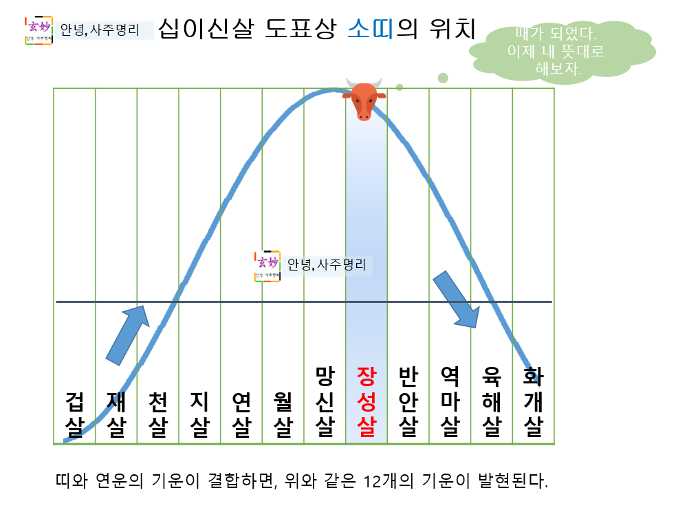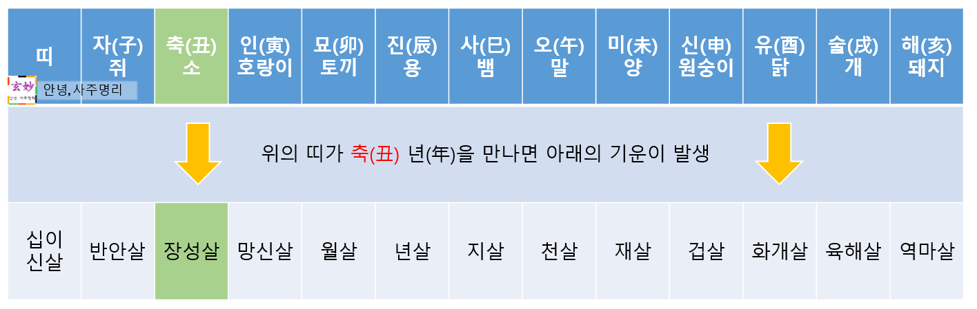 丑(축토)가 丑(축토)를 만나면 장성살의 기운을 갖게 된다는 것이 십이신살의 이론의 핵심입니다.