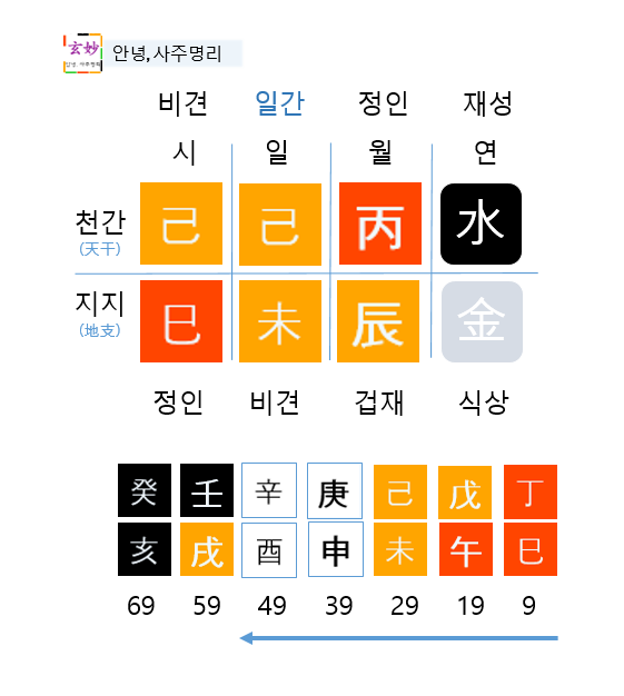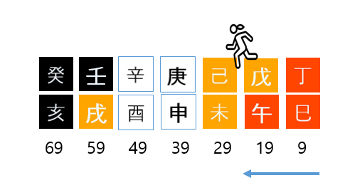 9세부터 시작된 화토의 기운이 30년을 흘러갑니다. 그것도 아주 조열하고, 버석버석한 조합의 정사, 무오, 기미가 연달아 기다리고 있습니다. 다행히 39세 이후에는 노년까지 쭉 금수의 기운이 들어오기 때문에 다행으로 볼 수 있는데,