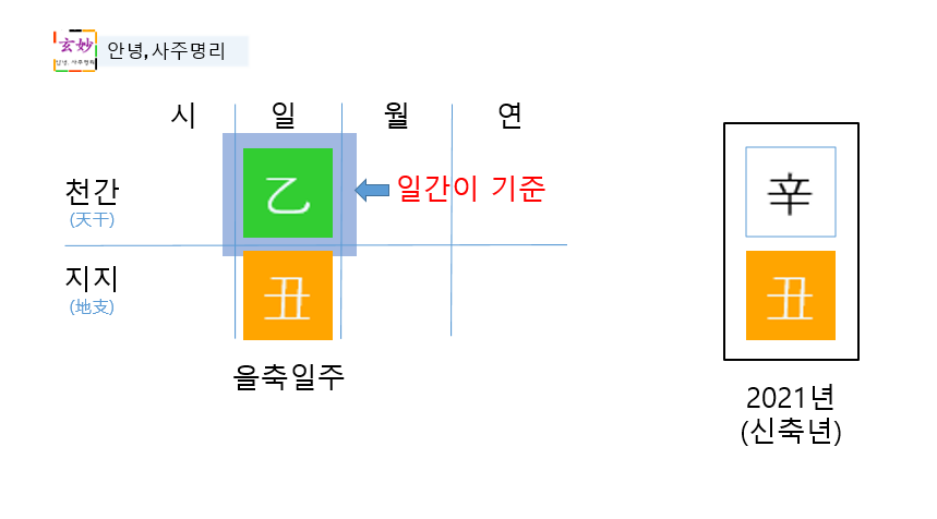 을축일주의 일간은 乙(을목)이기 때문에, 乙(을목)을 기준으로 신축년의 辛(신금), 丑(축토)와의 관계를 따집니다.