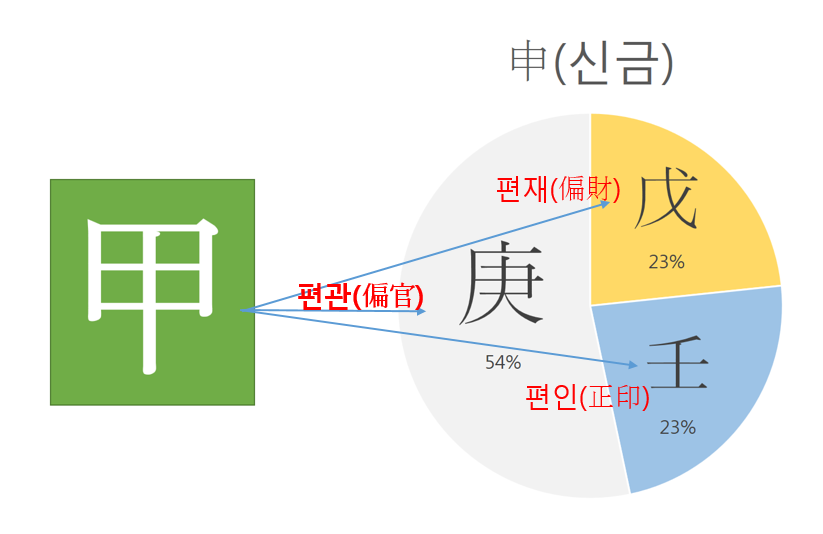庚(경금)은 갑목과 음양이 같고 경금이 갑목을 극(剋) 하므로 편관(偏官) 입니다.