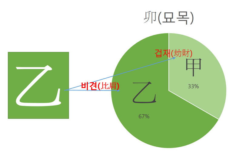 甲(갑목)은 을목과 음양이 다르고 같은 오행(木)이므로 겁재(劫財) 입니다.