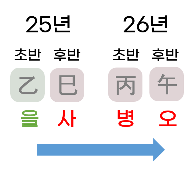따라서 을사년의 포인트는 25년의 초반의 상황과 후반의 상황이 완전히 다르게 펼쳐진다는 것입니다.