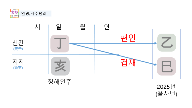 정해일주의 일간은 정화이기 때문에, 정화를 기준으로 을사의 을목, 사화와의 관계를 따집니다.