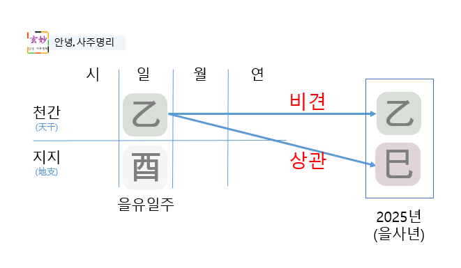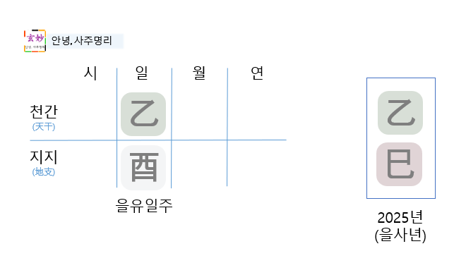 을유일주의 일간은 을목이기 때문에, 을목을 기준으로 을사의 을목, 사화와의 관계를 따집니다.